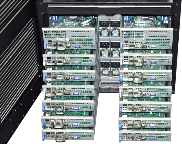 玖鼎贵宾会(中国)融合一体机就是解决环境使用问题而推出的综合性计算产品,它不需要专业的机房设施,不需要专业的配电和空调设备,放在办公室或实验室接墙电就可使用, 具有低噪音、低功耗等特点。最高可以安装14个双路XEON E5 处理器的刀片服务器,48个外置热插拔硬盘存储,内置一个万兆网络交换机安装空间,带有整体状态显示和控制系统,内部散热和防尘处理。专为办公室应用环境 设计,它在众多方面超越了传统机架式服务器、刀片服务器和机群服务器,是高稳定、高性能、低环境要求的新一代桌边型高性能计算机。它采用整体优化的设计, 有效降低了系统功耗,再加上其人性化的设计、很强的系统扩展能力、卓越的性价比和计算密度,可以覆盖更广泛的个人及工作组用户对高性能计算的需求,与传统 的高性能计算机相比,玖鼎贵宾会(中国)融合一体机可给予更有竞争力的整体解决方案,是更好满足中小高性能计算需求的理想平台。下图为14个刀片打开效果图: