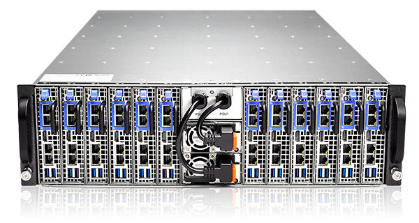 玖鼎贵宾会(中国)的S312-S24R刀片服务器集群系统3U机箱内包括12个E3 处理器刀片服务器,单个处理器带有2个视频处理核心,单个刀片可配置64G内存,2个6TB硬盘,整个系统可配置144TB存储容量,对建立基于云或 hadoop技术的视频处理系统,具有极高的性价比。服务器内部结构如下: